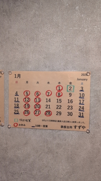 名古屋の居酒屋「鉄板台所すずや」のブログ 1月カレンダー